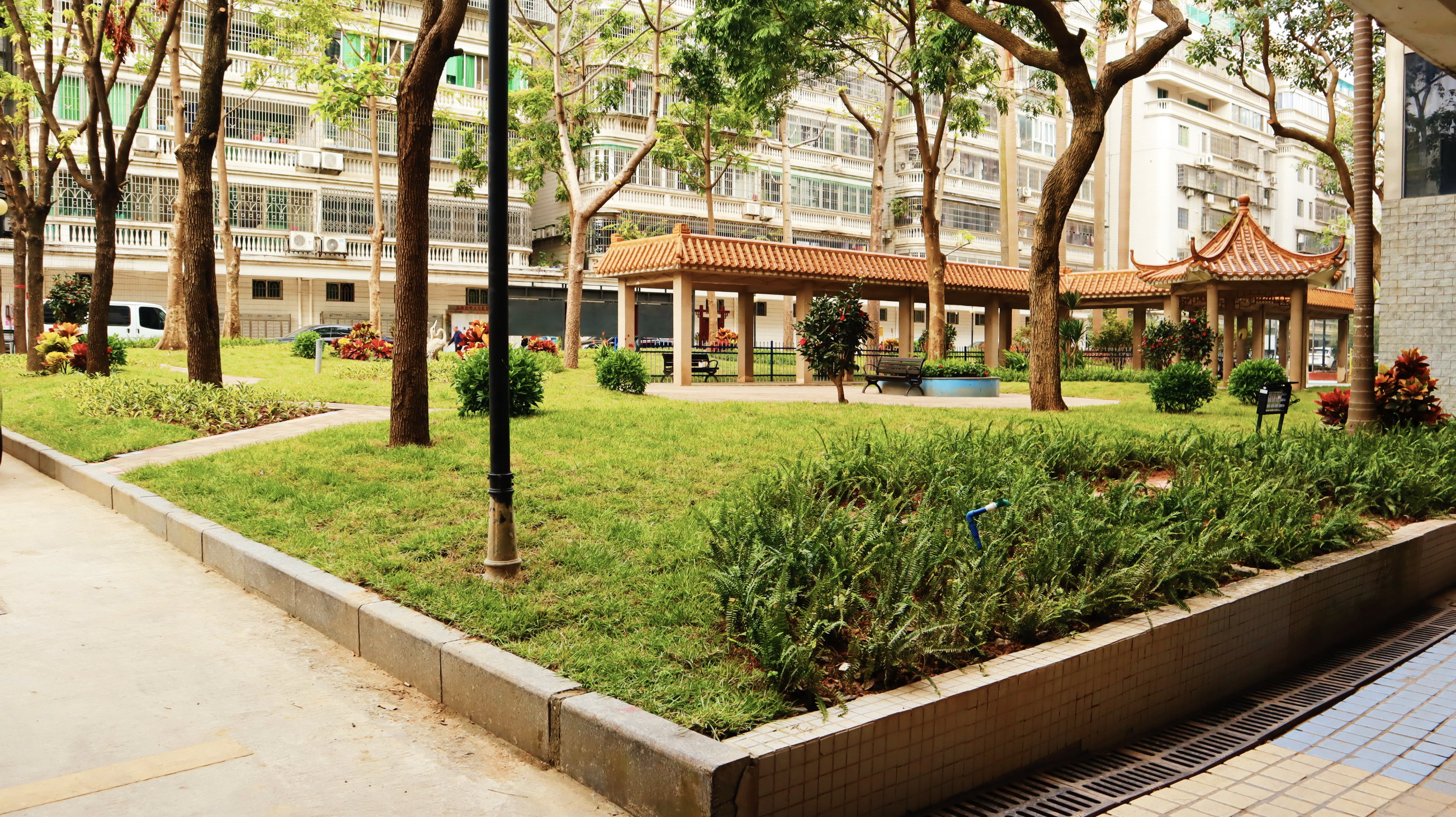 此前,小区内建成二十多年的老旧公园草皮枯黄裸露。