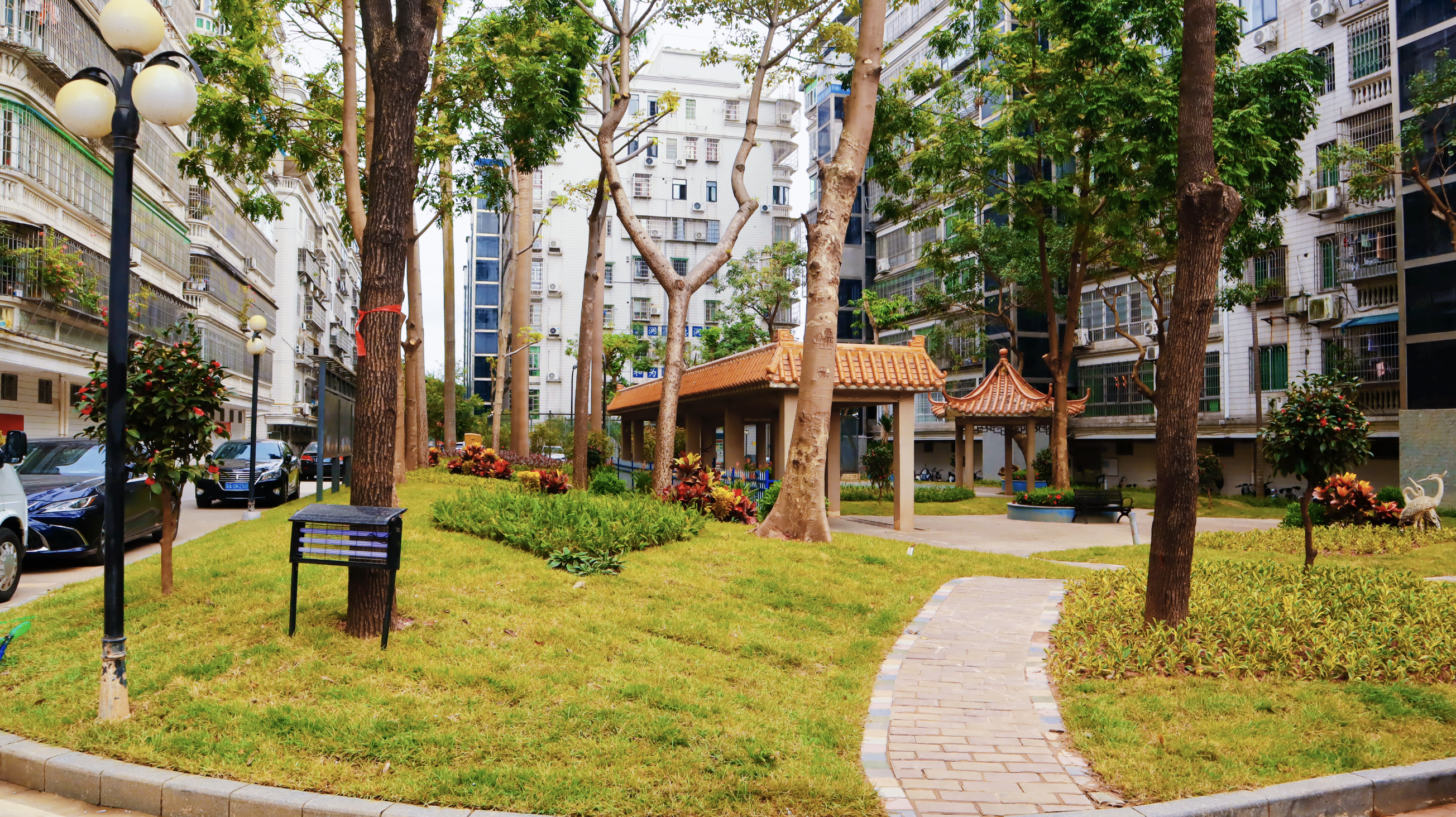 小凉亭周围,盛开的朵朵灰茉莉散发出清雅的香气。树下设置的休闲座椅,成了老人们聊天、下棋的好去处;曾经荒芜的角落,如今种上了花叶良姜和七彩鸟蕉。